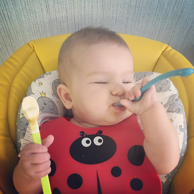 В этом месяце начали прикорм, пока в рационе только цветная капуста и брокколи, сегодня начали кабачок, ест вроде неплохо, гр 60 в день, хотя некоторые дни бывает, что съест пару ложек и начинает плеваться. Ну я не настаиваю)) Очень понравились ложки, как минимум одну обязательно заберёт и сидит с ней, периодически запихивает в рот))