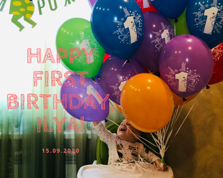 Я не успела ничего особого придумать или заказать на Али гирлянды, поэтому купила в «Затее» накануне забавную зелёную гирлянду с драконом со словами «С днём рождения», которая удачно легла на зелёную же тюль на фоне зелёного стульчика именинника, туда же был подвешен шарик в виде цифры 1. Папа наш сделал нам сюрприз и заказал 25 шариков с доставкой на дом. Их привезли утром и честно, мы с Илюшей были в восторге. Я искала всякие шарики и везде натыкалась на «инста наборы» с цифрой и парой шаров. А 25 штук простых шаров с гелием доставили ребёнку больше радости. Он и развязывал и отпускал их по очереди в потолок, и ловил потом и прыгал с ними по дивану. Сегодня третий день и они до сих пор как новые и Илья играет ими каждый день.