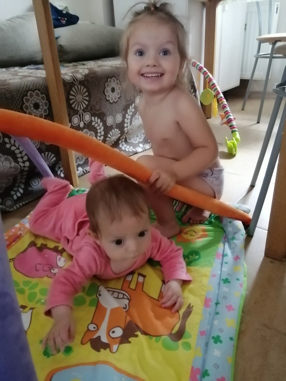 Очень странный месяц. Если с Валей в этом месяце произошли кардинальные перемены (поползла, села, стала стоять с опорой, зуб первый вылез), то Катя вроде поползла, а вроде будто брейк танцует, вроде подобие сидения есть, а вроде заваливается.