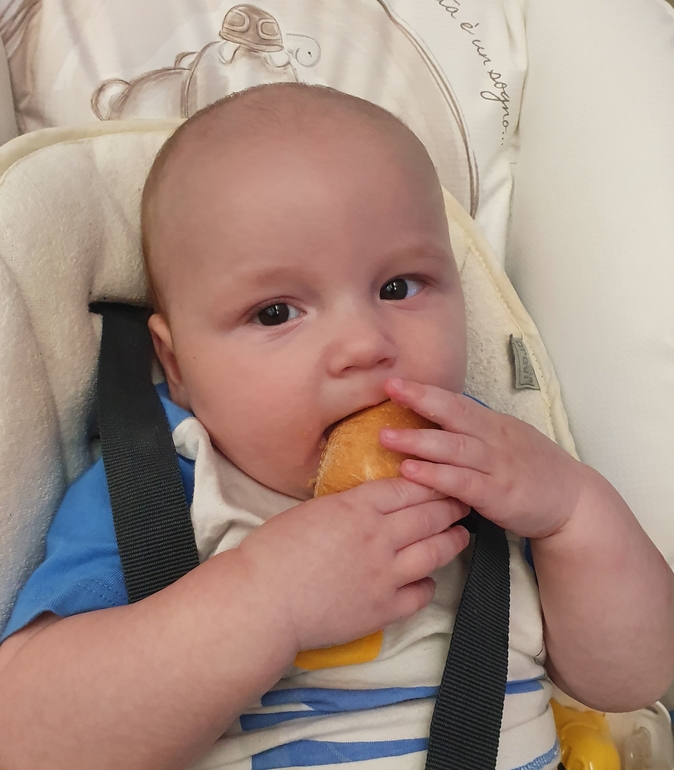За 2 недели попробовали банан и хлебушек, банан, естественно , понравился больше😀 Через 2 недели, а может и раньше, если будет хорошо себя чувствовать, начнем прикорм. Какими же голодными глазами он смотрит на нас, когда кушаем. Один день держала его на руках и миску с салатом, так он схватил ее обеими руками и всю голову туда засунул😂