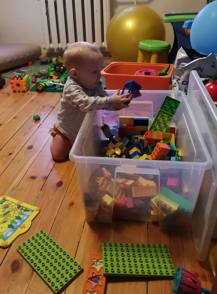 Показал мне, что может ползать на четвереньках, но по привычке плюхается на живот и улепетывает. Стал садится и из положения стоя, но сидит все еще придерживаясь 1 рукой. Чаще всего сидит у брата в комнате у контейнера с лего на коленях и выкидывает кубики.