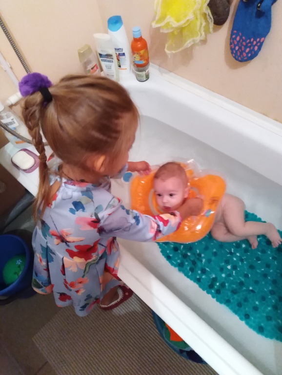 7. Очень любит сестру. Улыбается и тянет к ней ручки. Подпевает, когда она поёт песенки.