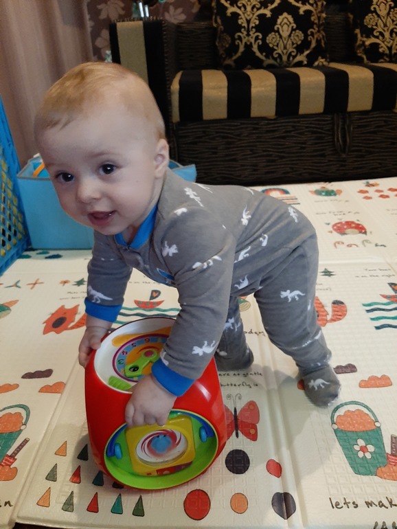 встаёт у любой опоры, стоит, держась одной рукой, иногда на пару секунд и ее опускает. Вначале конечно без полётов не обошлось, сейчас уже научился группироваться и садиться на попу) Теперь любимое занятие- вставать у опоры и садиться обратно - и так по 100 раз на дню 🤪 пару раз замечала попытки шагать вдоль опоры, думаю скоро займётся этим делом всерьёз)