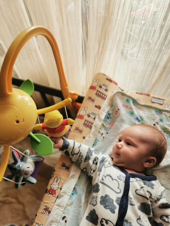 Вот уже как пару недель Ильюха научился хватать игрушки на мобиле и на коврике, еще очень неуверенно, больше похоже на случайность, но все же, постоянно лупит рукой, разжимает ладошку аккуратненько хватает, вообще любит мобиль и коврик, улыбается игрушкам на них. Еще ему очень нравится звук колокольчика и погремушка-шарик. На пол пока его еще не переселяю, но чувствую скоро уже это случится, когда он научится вертеться. Ох, как бы старшие его не затоптали😅