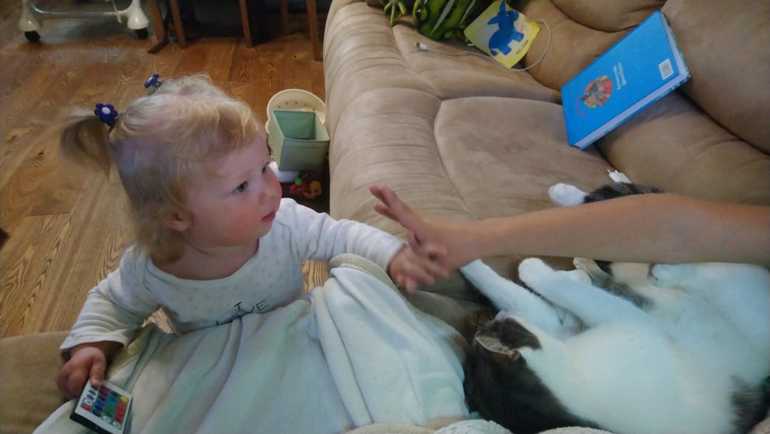 Дочка знает многие части тела и показывает на себе и на других - пуп наш любимец, тычет в свой нос, высовывает старательно язык, теребит уши. Ловит котов за хвосты, обнимает их, выдирает шерсть. Кот все терпит, а кошка пытается обходить стороной.