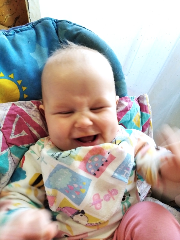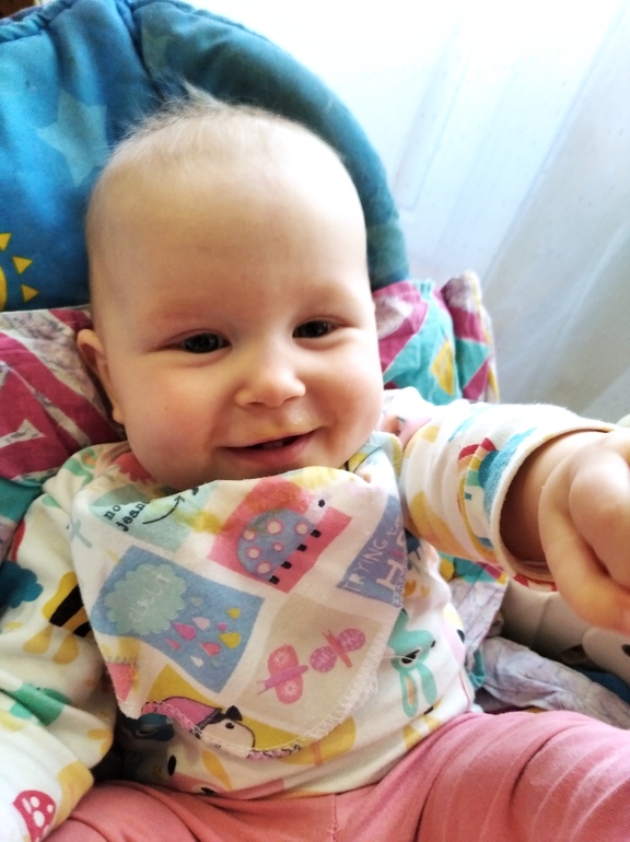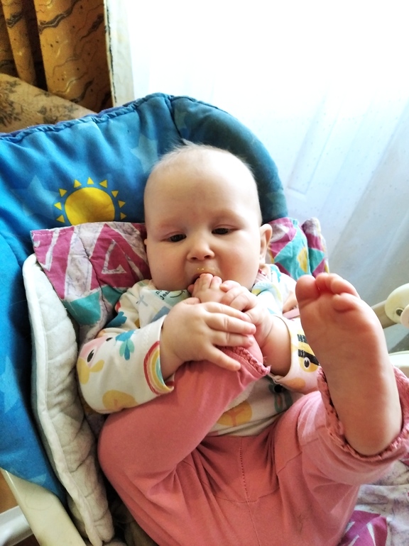 В ванне до сих пор плавает в круге, но уже поднадоело, любит просто на моих руках ловить игрушки. Купание и массаж каждый день.