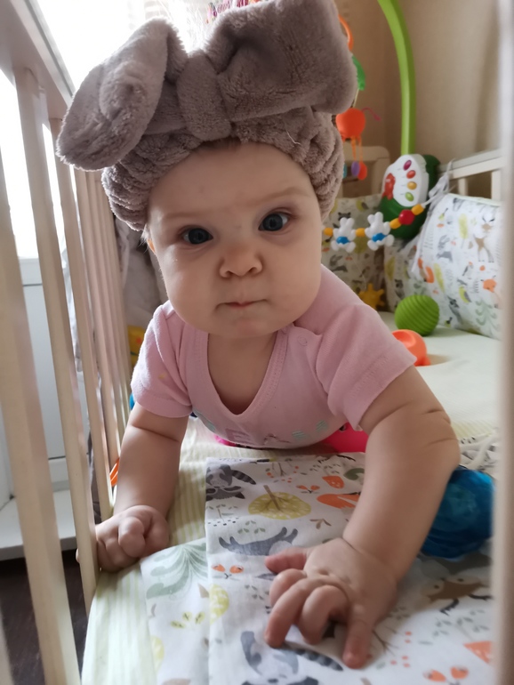Ползать ползаем с 5.10, но пока на животе загребая рукой и противоположной ногой. На четвереньки встаёт, пытается перебирать и опять падает на живот и впуть по всей квартире. Ходим осторожно теперь, оглядываясь.