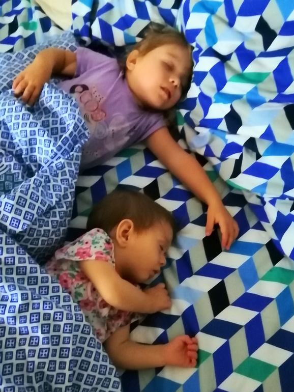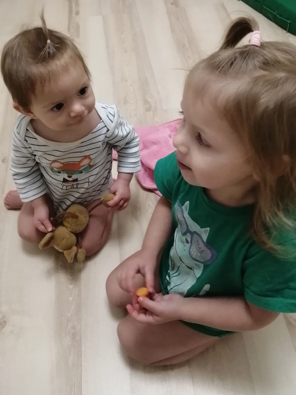 Всегда забываю написать про самостоятельность. Катюха только недавно перестала паниковать, когда теряла меня из виду. Может проиграть с Валей, иногда они такую бесячку устраивают) Но всё равно хвостиком за мной бегает, и если ей скучно, становится рядом, хватает меня за ногу и издаёт вопли динозавра. Впрочем, чаще всего это значит, что она хочет есть или спать 😌