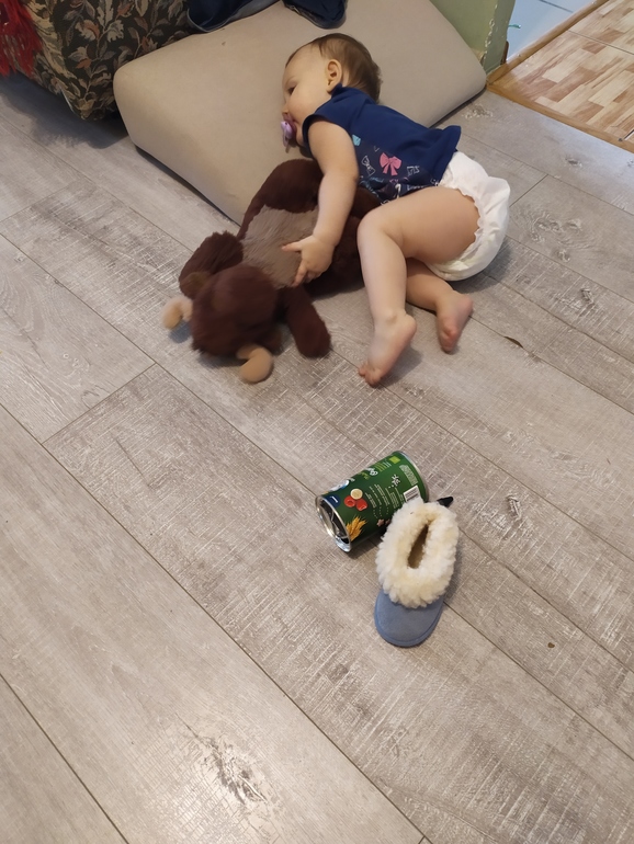 Любимая игрушка тоже есть. Сама схватила в детском мире. Теперь не расстается с этим жутким лосем) и спит, и гуляет с ним
