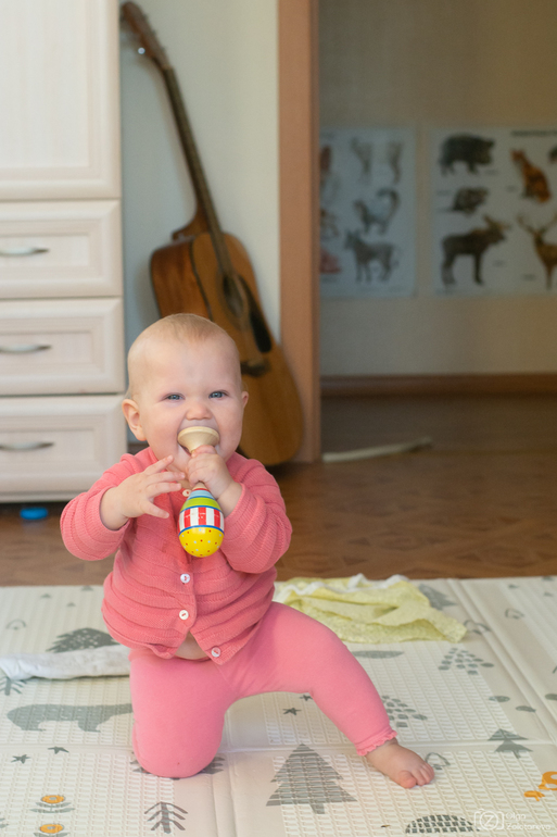Вся ушла в двигательную активность, видимо. Носится по всей квартире, всё изучает. Ползать поднадоело, видимо, но сделанный на днях туннель вернул интерес (писала о нем здесь). А так тренируется в стоянии каждые полминуты. Метр про ползёт - встанет, полминуты постоит, снова метр - и стойка, и так далее. Как медвежонок)))