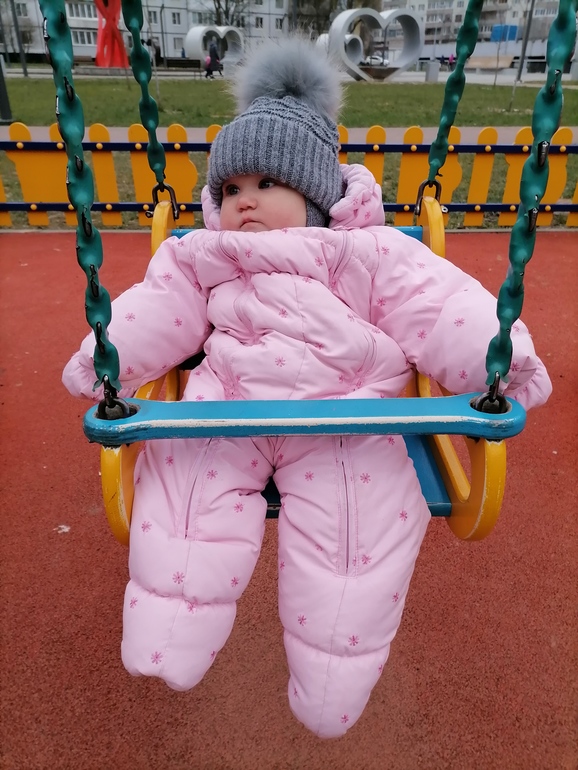 Играет с папой в мяч: хватает катящийся и толкает, несколько раз подряд. Это приводит в восторг всех участников действия. Ещё любит прятки, и со своим непосредственным участием, и предметы прятать-находить. На площадке освоили качели и горки (вот это восторг!).