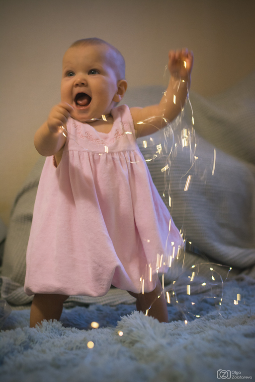Восторг и интерес выражает звуком... Между "о" и "ё", как английский звук. А мамкать перестала. Пару недель назад ползала за мной, говоря "мамамам", я уже это ей в качестве первого слова записала, а тут на тебе - передумала дочка.