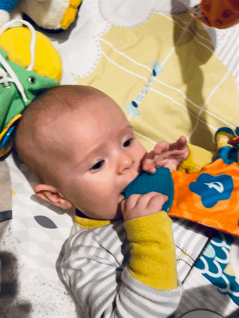 ✍️Несмотря на то, что мои пальцы - это топ, всё равно они не единственный способ прорезывания:) Саша начал грызть специальные, предназначенные для этого инструменты!:) Но в идеале всё равно, если я их у него во рту шевелю) Ему нрав)) И еще интересно зашёл прорезыватель с эффектом охлаждения (в морозилке превращается в лёд).