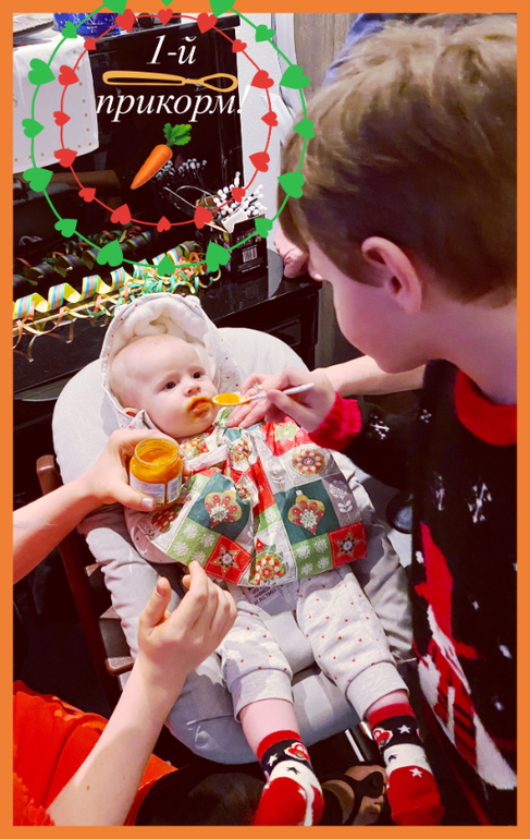 ✍️Ввели прикорм аккурат в НГ😊 31.12. дали ему его первую морковку. Буквально 2-3 ложечки. 03.01. - яблочко, уже ложечек 5-6. Впринципе ему зашло (яблоко больше, чем морковка), но технику глотания с ложки пока не до конца освоил) Половина лезет наружу)) Буквально вчера первый раз проглотил всё с 1го раза😊 Ротик навстречу ложке уже с готовностью открывает.😜 А также пытается схватить ложку руками и злится, когда ему не дают кормить себя самому😊