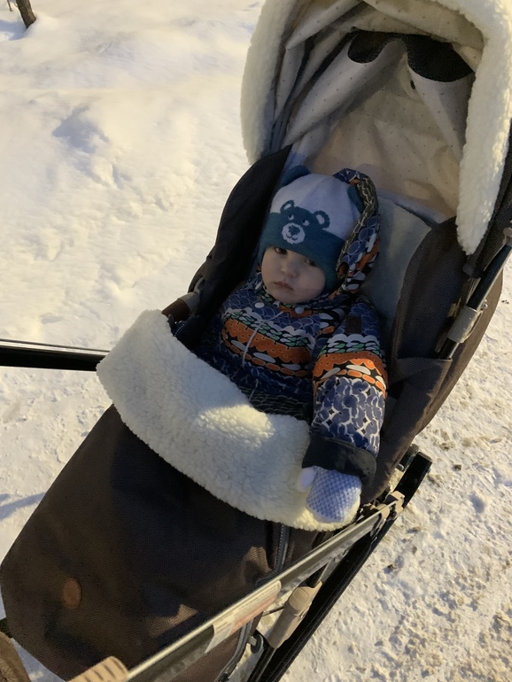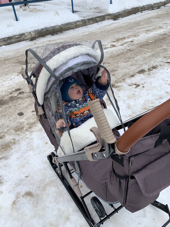Короче, выбрали топчик. И ребёнок сел! И более того, он в них шикарно спит на прогулке. А я ещё возмущалась, нафига в санях амортизация. Слинг лёг на полку, наконец, спина моя рада.