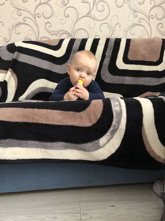 ✅ играет в ку-ку: накрывается одеялком/пеленкой и ждёт , пока мы говорим : а где тимоша?? Потом открывает одеялко и смеётся)