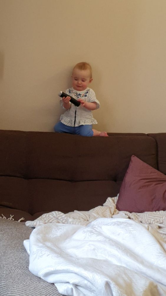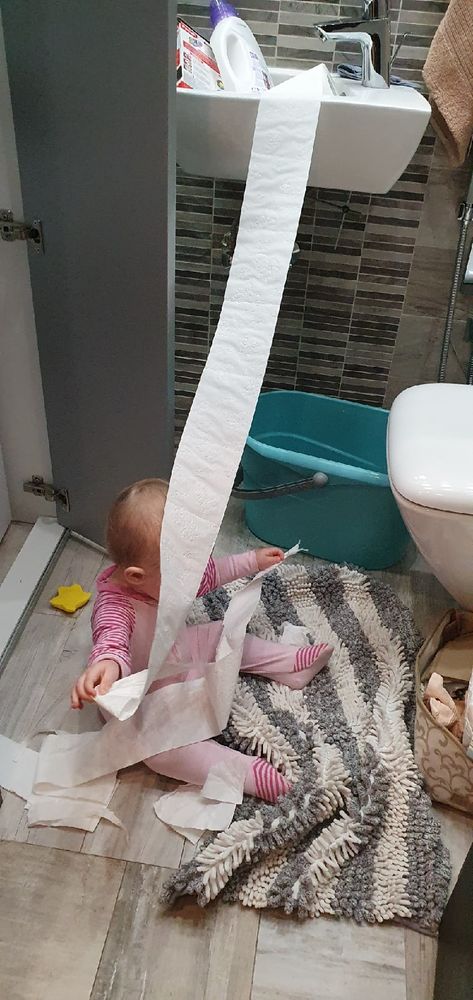 Месяц выдался активный.Алиса делает шажки без опоры, может стоять без рук.Вылезли два зуба , и еще лезут два.Залезает с пола на диван, потом на спинку дивана и сама слезает ногами вниз (!!!).Она поворачивает корпус специально, что бы ногами слезать вниз.Очень хороший навык :) Так же залезает на нашу кровать с пола, на диван в детской.В общем за этот месяц она в плане лазания по поверхностям спец.Стала вставать на цыпочки и доставать все с высоких поверхностей.Из последнего - встала на цыпочки и достала специально убранную туалетную бумагу.Вуаля рулон был порван на кусочки за секунду.Так и не понимаю как она его достала из раковины то... Режим такой же, как и был.Встает 6-7 утра , первый 9-10 утра, второй 13-00-14 00.Иногда бывает и позже.Но отбой в 19 30 всегда.