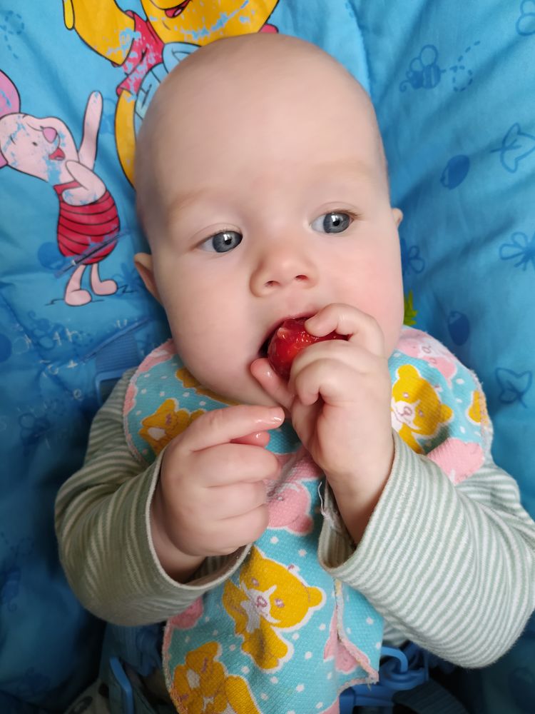 Прикорм идёт хорошо,пробуем все по немножку. С общего стола тоже по чуть-чуть(фрукты, овощи отварные, каши, картошка). Ест пюре и маленькие кусочки.
