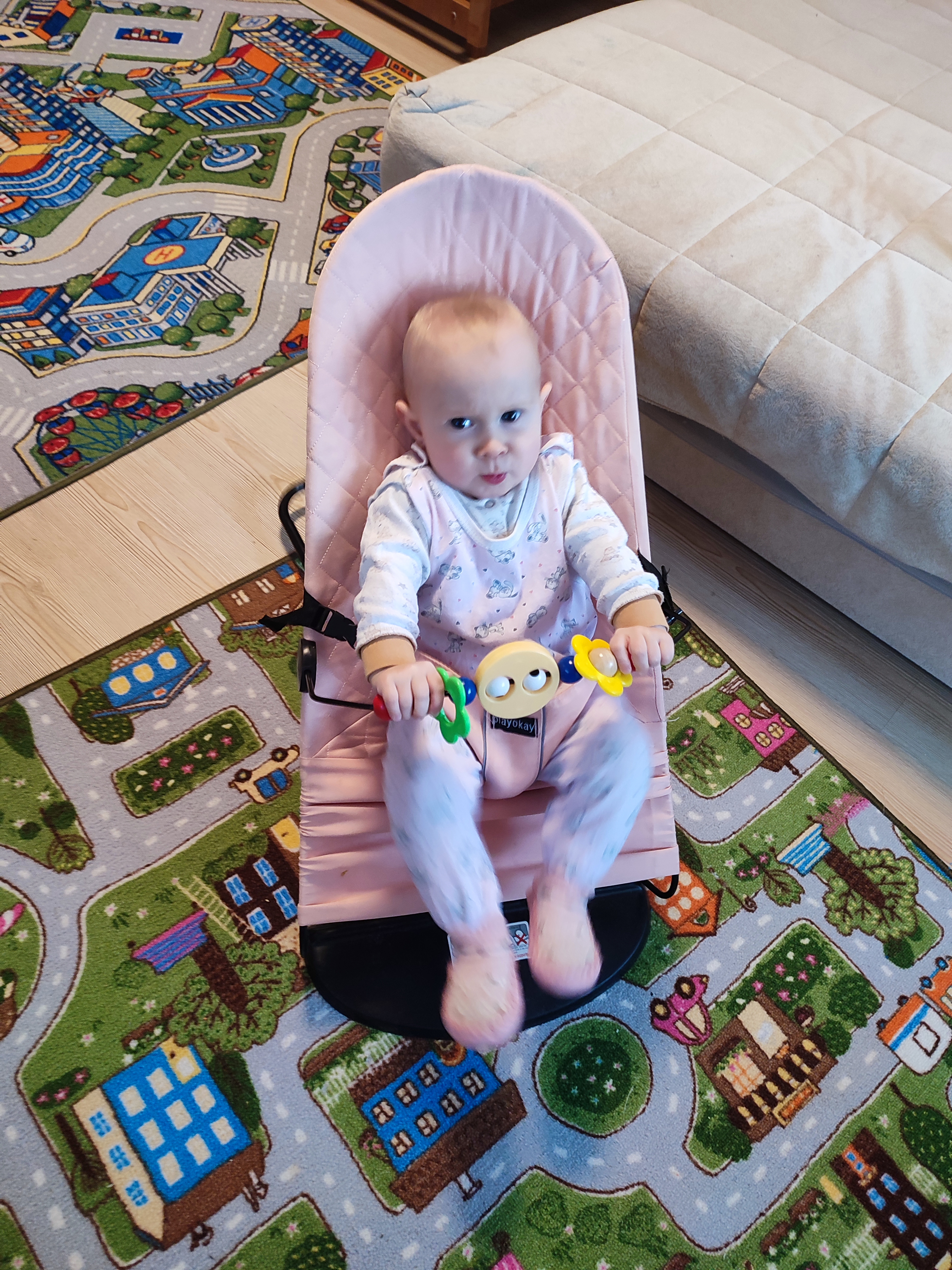 За счет маленьких размеров, мы до сих пор пользуемся шезлонгом, очень нас выручает) Алëна использует его в качестве качелей, и иногда даже засыпает там. А перед выходом из дома я кладу уже одетую в комбез дочку в шезлонг, в коридоре, потом одеваюсь/обуваюсь сама.