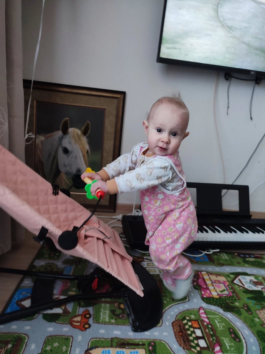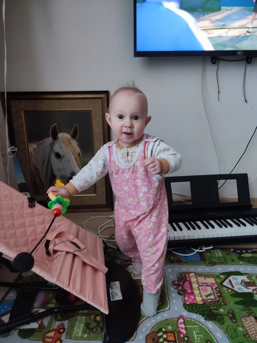 Сама еще не ходит, только с опорой и за руки. Но на днях стала пробовать отпускать руки, держать равновесие, уже может так постоять некоторое время, не падая.