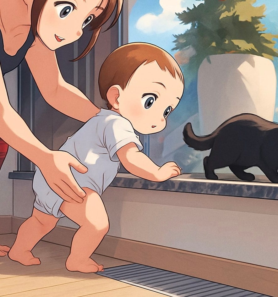 Она уверено встала на ноги и,держась за низкий подоконник,пошла в сторону кошки.