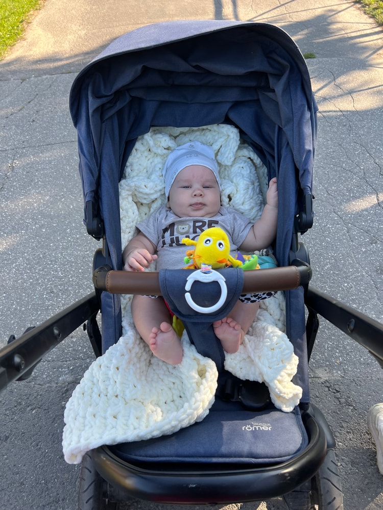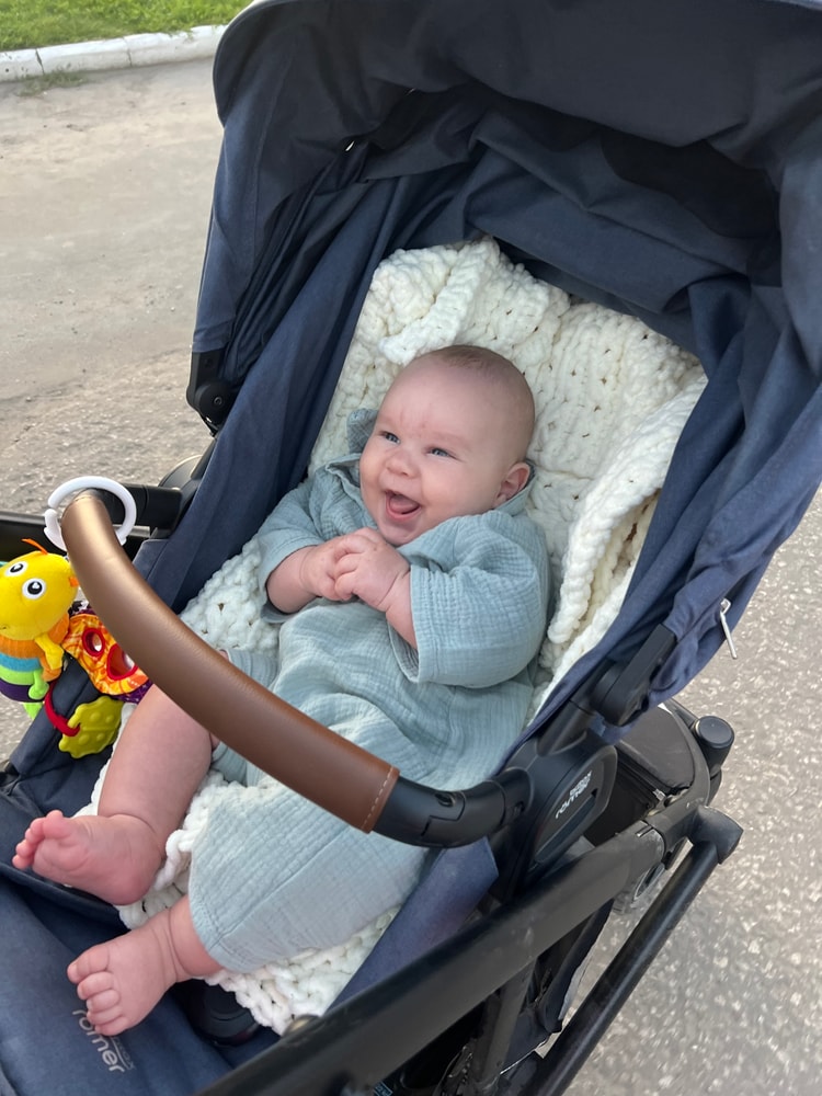 Перешли в прогулочный блок полусидя (иначе орет) и лежа на сон. Решила, что это лучше, чем в автолюльке, в которой он еще согласен ездить. А на слинг у меня не всегда хватает здоровья спины.