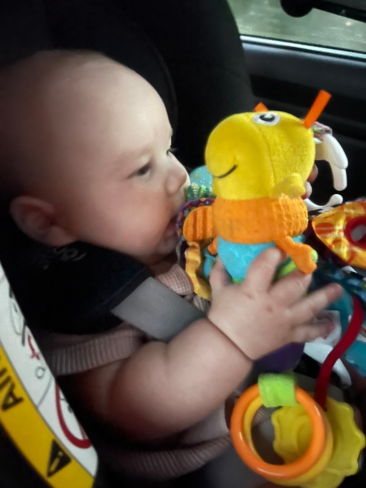 Держит игрушки уже прямо уверенно. И облизывает их тоже очень уверенно.