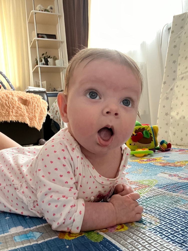 - с каждым днем увереннее держит голову на животе, опираясь на предплечья. Иногда вытягивает правую ручку вперед;