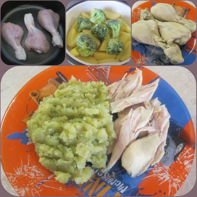 МясоДевочки, получается очень нежное и сочное мяско, так же опробованно с кроликом, тоже очень вкусно, а главное - время на подготовку продуктов минимально. И так, с голеней снять кожу, помыть и положить их на дно кастрюльки мультиварки, БЕЗ масла, соли, воды или еще чего-то, абсолютно без ничего!! Далее ставим чашу для варки на пару и закидываем овощи, у меня была картошечка и брокколи (не советую морковь. даже тонко нарезанная остается хрустящей). Закрываем крышку и включаем режим тушение на 2 часа. Все, идем гулять с ребенком или занимаемся своими делами, не вспоминая о нашей чудо-кастрюльке))) Еще раз повторю, мы ни чего не наливаем, ни какой воды или масла, ни каких специй, вкусно даже для взрослого получается. Через 2 часа можно кормить свое чадо и кушать самим)) Я решила из овощей сделать пюрешку)) Приятного аппетита))
