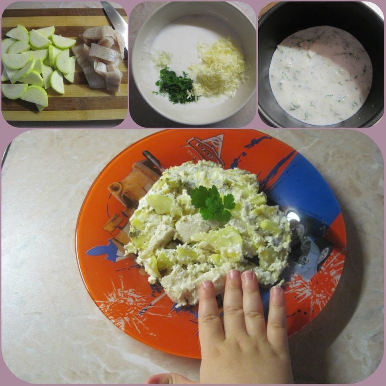 Нам понадобится: морская рыба грамм 200-250, пол кабачка, 100-130 мл кефира, сыр 40-50 гр зелень, чеснок, растительное масло.