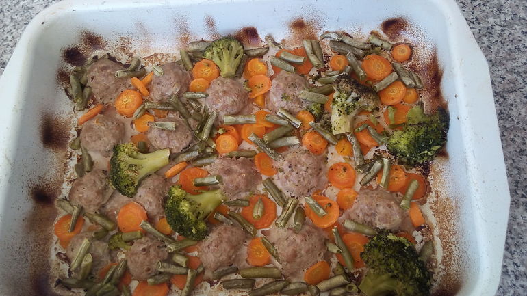 Для котлет: говяжий фарш, лук, яйцо, немного соли. Сформировала маленькие шарики и в духовку с морковью, брокколи и стручковой фасолью. Сначала на ~160° до готовности, потом на 200° для небольшой корочки. Получилось немного суховато. То ли сразу на 200° надо, толи бульона добавить.