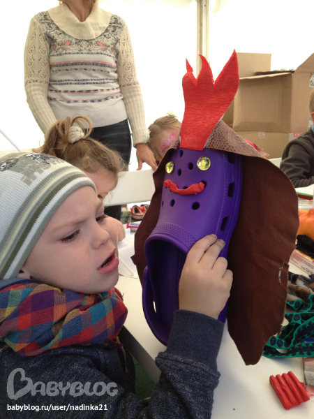 Потом детишки мастерили новые кроксы-куклы для постановки "Кот в сапогах". Паше достался король - вот такой у нас он получился общими (Мама+Паша) усилиями