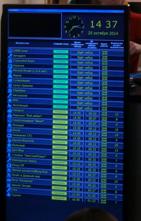 Выбирайте занятие по душе и записывайтесь! Есть электронные табло, на которых отображается где идет набор: