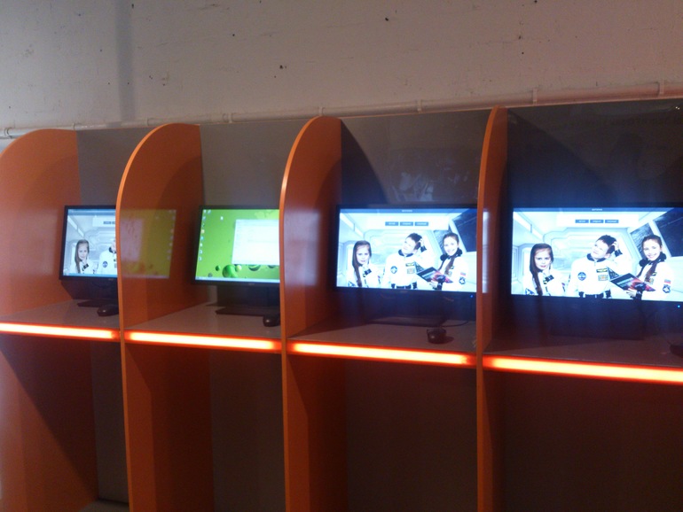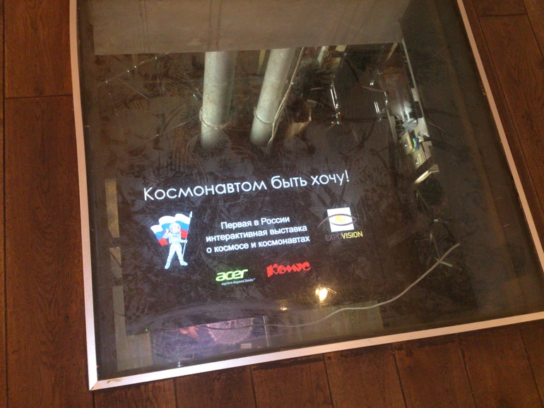 Это вся выставка... Не поняла, где обещанные 40 интерактивных экспонатов??? Даже, если посчитать все плакаты и тюбики с едой, навряд ли их столько наберется :( А, впрочем, там есть с десяток компьютерных панелей, на которых крутятся какие-то ролики. Вероятно они и были интерактивными, а мы не поняли. На ресепшене спросила: "Где же площадка "инопланетяне"?" Оказалось, на 2 этажа вниз, выход на балкон через кафе. Вот эта занесенная площадка с уродливой ракетой: