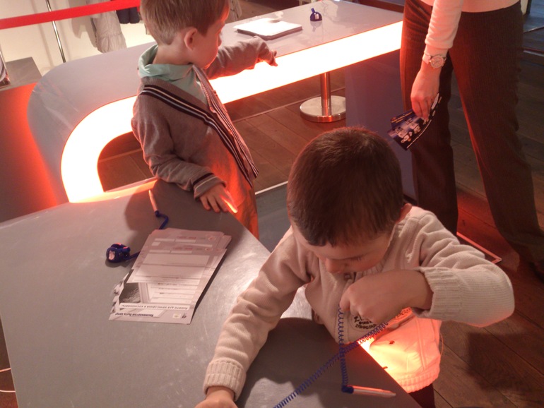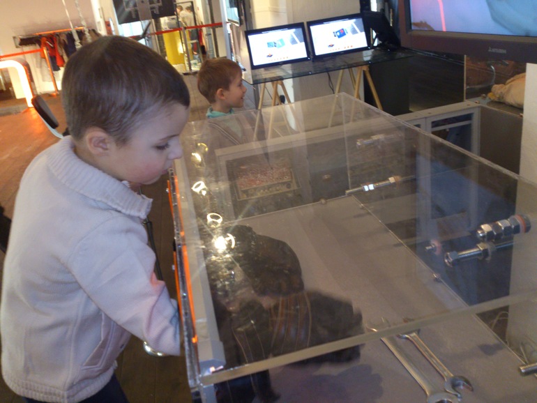 Я знаю что такое "лофт". Но такого здания не ожидала. Там съемки советского общепита 30-х годов хорошо проводить: выщербленный белый кафель на стенах, запах горелого масла по всему зданию, гастарбайтеры, ведущие какие-то работы на каждом аппендиксе этажей, узкая травмоопасная лестница... Но аннонсировано было красиво, вывески-указатели на каждом этаже, так что взобрались на 5 этаж. Стоимость взрослого билета 250 рублей. С нас попросили еще и по 150 за детский билет. Ткнула им в стационарную надпись у на их же на стойке: бесплатно! Пропустили. Есть одинокая вешалка у входа, можно раздеться и повесить все на плечики. Но вот скамейки никто не предусмотрел для переодевания детей. Ничего, мы негордые: я сходила в музей (перешагнула красную ленточку) и принесла нам табуретку. Так она там потом благополучно и прижилась :)