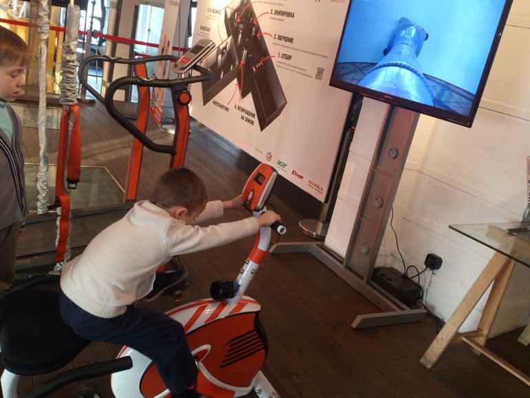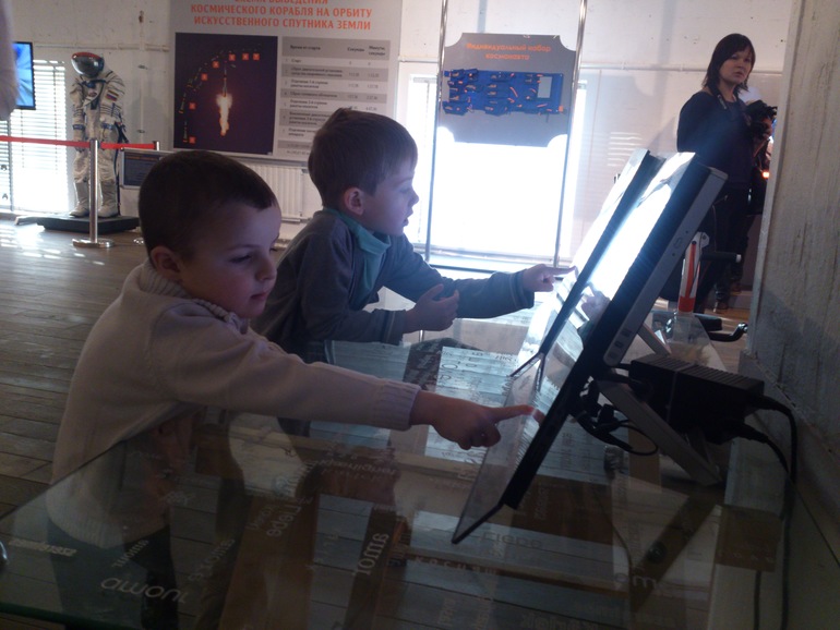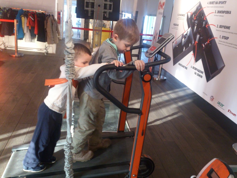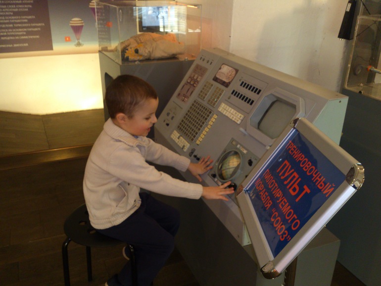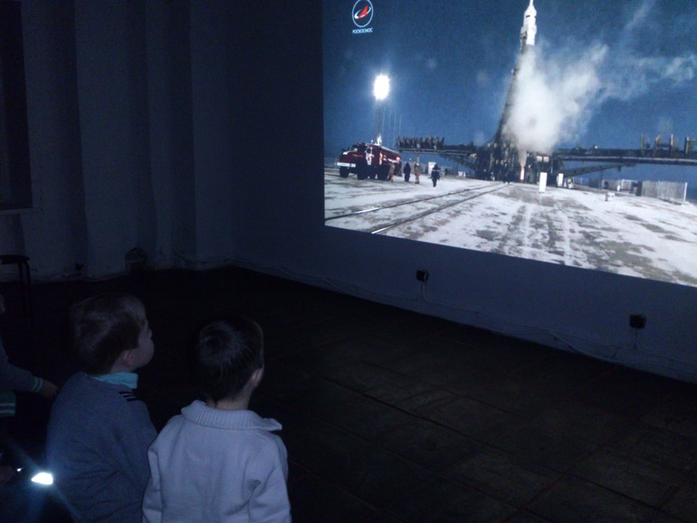 А вот дальше кинозал с просто шикарным фильмом! Очень здорово, по-человечески, а не пафосно-геройски, снят фильм про космонавтов, космос, полеты, Землю. Временами есть анимация. Абсолютно понятно для любого возраста как построена ракета, как отваливаются в полете ее ступени, как готовят космонавтов, что они чувствуют при взлете, в полете, в невесомости. Как организован быт на орбите. Как непросто возвращаться на Землю.