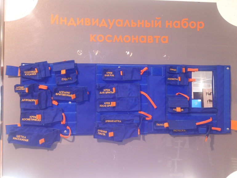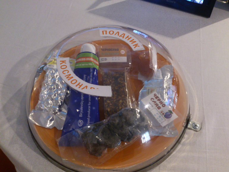 На столе прибиты намертво пластиковые сферы с едой космонавтов: