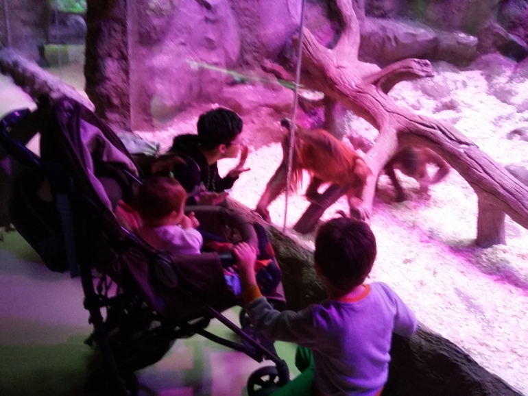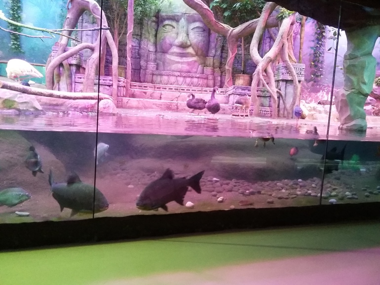 Вольеры просторные и сделанные с большой любовью как к животным, так и к посетителям. Высота воды около метра. Подвезли коляску с Кирой прямо к стеклу, она пыталась поторогать рыб. А мы сидели рядом на скамейке и старались рассмотреть все детали: