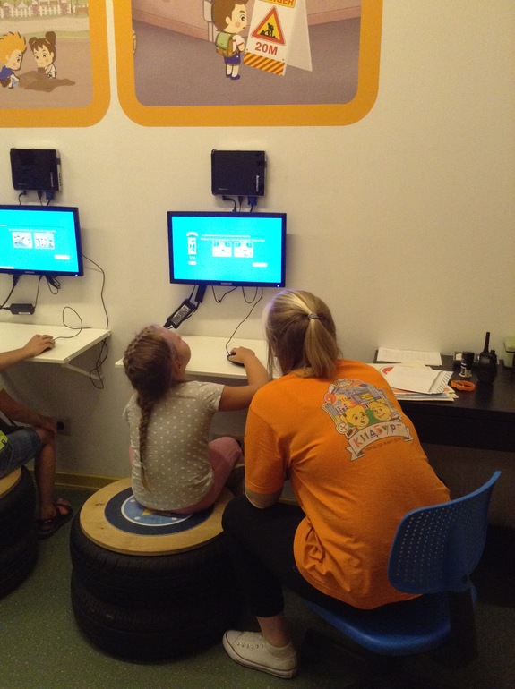 Мы пробыли там с 15:00 до 19:45! И вот до 18:15 - дочка попала в три профессии! А за оставшиеся 1,5 часа - еще в 4! После 18:00 народ сильно схлынул и в Кидбурге стало классно! вот правда! Как туда люди ездят в выходные, да еще и не летом (когда все в разъездах) - для меня загадка)))