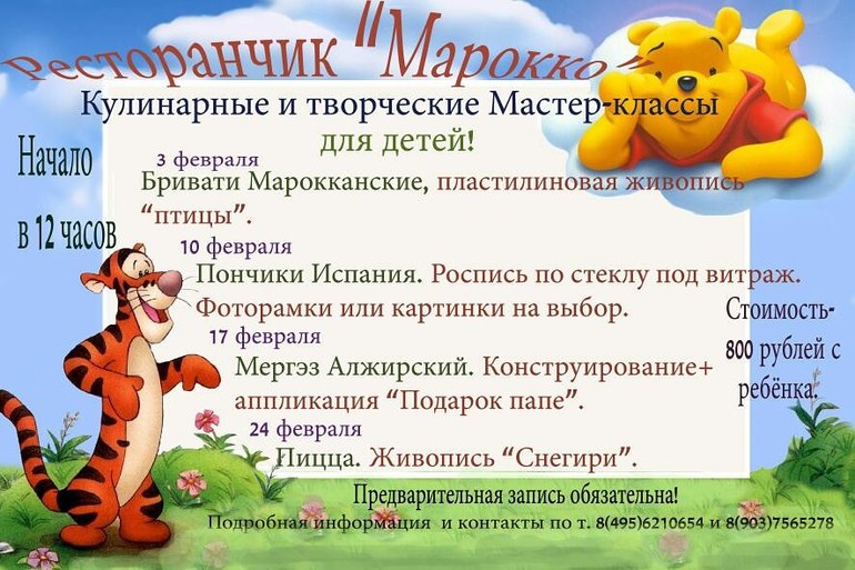 Мастер-классы проходят по субботам. Тематика разная. Оплата за 2 мастер-класса-800 руб.