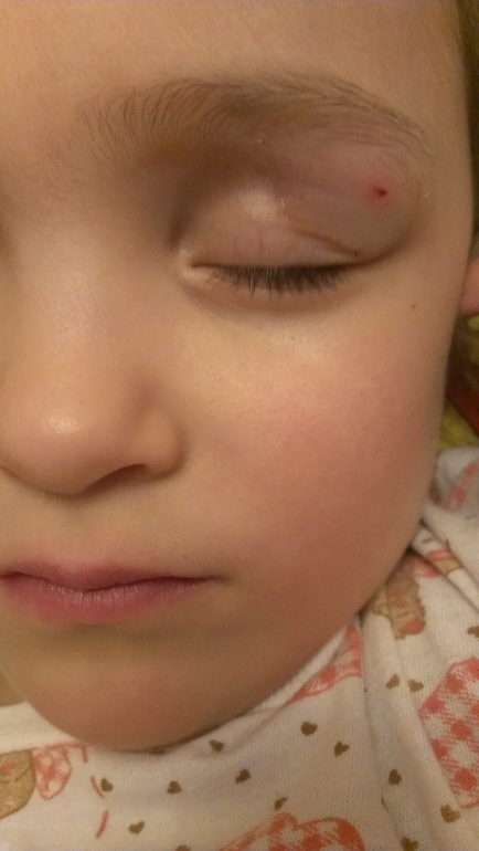 Дочка вчера налетела глазом на железный крючок, ударилась надбровной косточкой, повредив кожицу.
