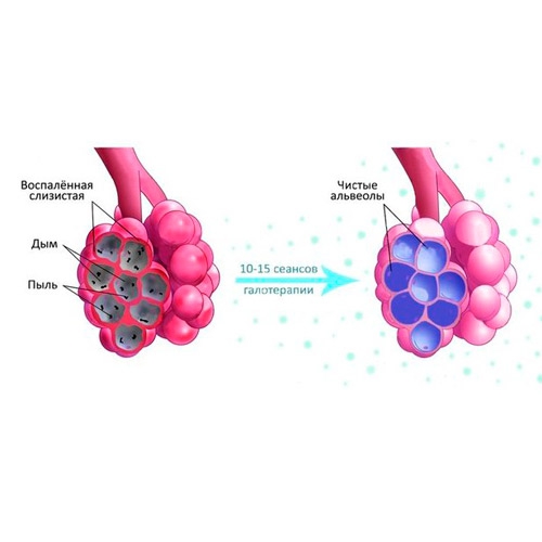на правом рисунке голубого цвета сурфактант, на левом он отсутствует. чтобы он восстановился, помимо галотерапии, нужно есть жирную пищу. Сурфактант увеличивает газообмен в 50! раз!