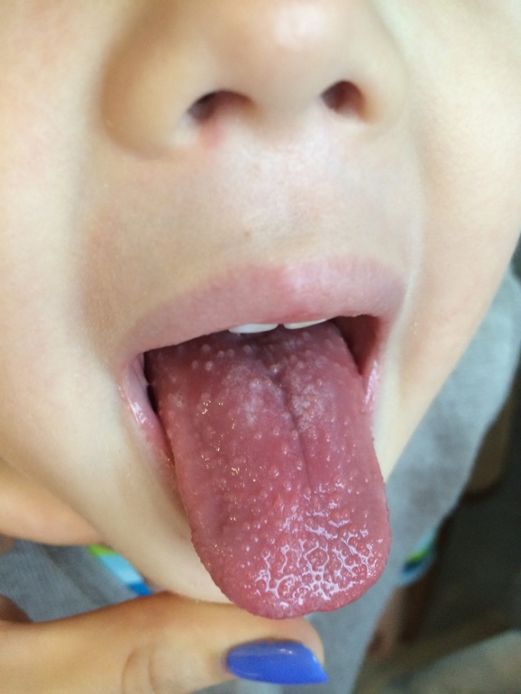 Нужна помощь!Началось всё с температуры и красного горла 4 дня назад. Врач сказала не ангина, просто красное горло. Три дня была температура (38.5-39), забиты нос. Температуру сбивали 3-4 раза в сутки, нос чем только не пытались, забит наглухо. И сегодня утром сын проснулся с соплями текущими, без темпы и с вот таким языком (фото под катом). Что это может быть?? Сыну 4 года, успели поболеть только коклюшем (не считая простуд и бронхита).