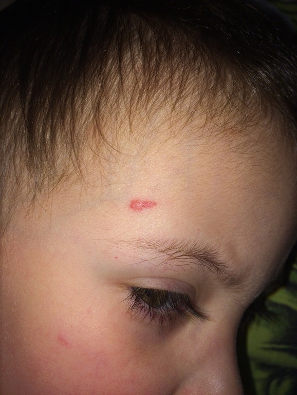 Около 5 дней назад появились как укусики от комариков, но не чесалось и не беспокоило ребенка. Сегодня глянула, пошел вокруг красный ободок. У нас их две шт. на голове (лоб).