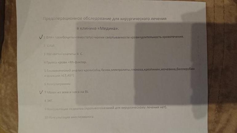 Что то маленький у вас списочек. Мы летом оперировались, 22 пункта было. Можно у них все знать якобы за 1 день в течение 2 часов и пройти всех врачей. Стоило все это дело 11 т-р. Мы платно делали операцию. Обязательно на руках должна быть эндоскопия. Мы к 8 ми утра приехали, прошли врача и заселились. В 10 операция. Утром в 8 уже домой.