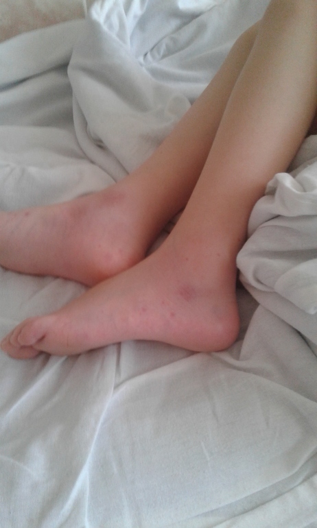 Аллергия и прочие высыпанияДоброго дня девочки! Подскажите что за напасть, у сына с 17 февраля по 20-е была температура 38/39, сбивали, 20 февраля обнаружила что у нас прорезался вторым рядом молочный зуб, пошли удалили старый, он немного уже подшатывался, темп спала, пошли к педиатру она сказала что у сына красное горло, прописала антибиотики флемаксин в связи с температурой, я их давать не стала, пшикала ему горло тантумом и давала цитовир 3, позавчера сын стал немного жаловаться на боль в пятках, а вчера утром при осмотре ног я обнаружила припухлости в области стоп, и небольшие синячки. Вечером попали с этим в больницу, врачи пока разводят руками, появилась еще и сыпь небольшая. Места припухлостей еще покраснели больше. сыну прописали постельный режим, на ноги он не опирается. Говорит болят они и он редко, но чешет их.