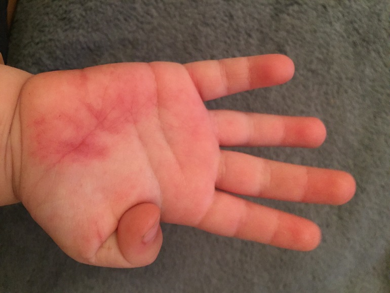Вчера утром обратила внимание, что дочка чешет ладонь, посмотрела а там покраснение и кожа немножко грубоватая... если провести пальцем, то чувствуются маленькие волдырики типа крапивницы... подумала, что кто-то укусил или сладкого переела, из того, что еще может быть это пластырь носила на этой руке, возможно это реакция на клей от пластыря... мазала фенистилом, алоэ вера... руку чесать дочка перестала, но покраснение будто не проходит...