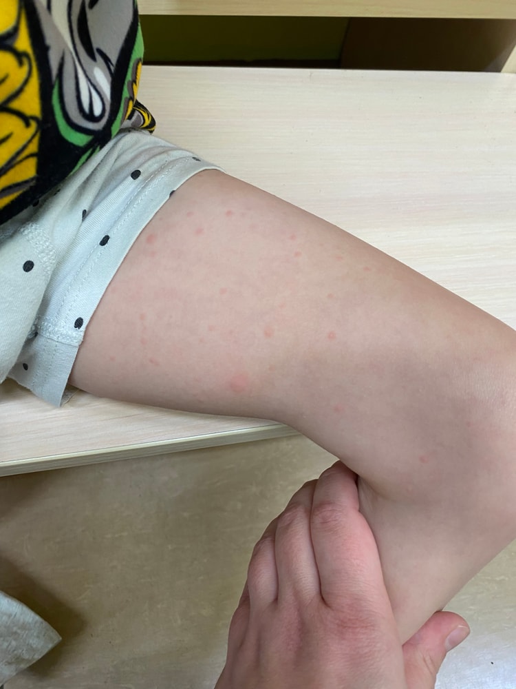 потом пришла домой смотрю, а у дочери тоже пятна на ногах и руках, на теле нет. До этого кушали все как обычно