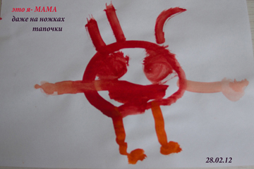 И цвет красок на этот раз выбрала повеселей, хотела еще себя дорисовать, но я забрала рисунок чтоб она "не испортила". Добавила свой портрет.