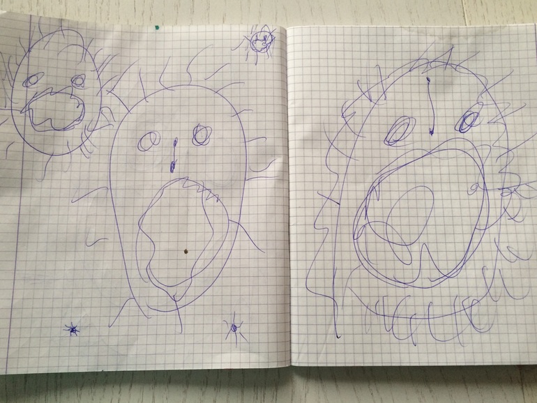 Ага, как из фильма ужасов картинка! Но эти рыбы действительно жутко выглядят. А вообще ему неплохо живется, если по художеству судить, остальные рисунки вполне себе позитивные)))